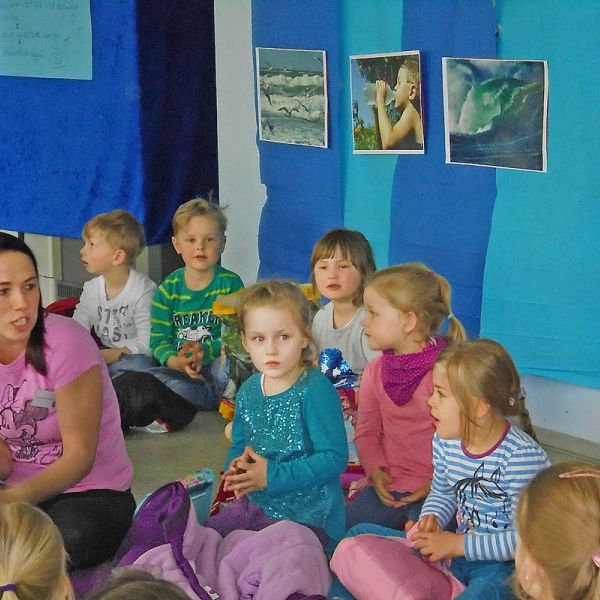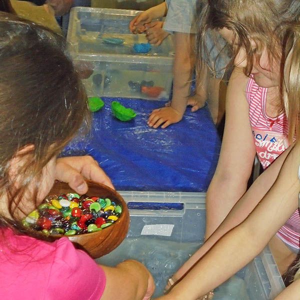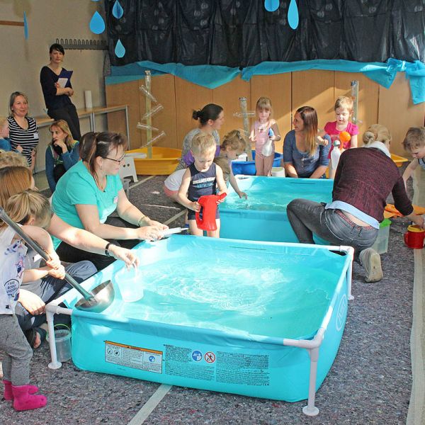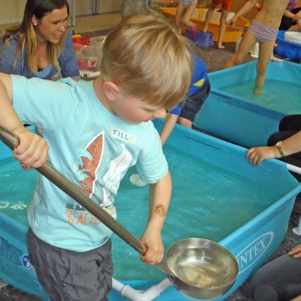 Es gab verschiedene Experimente zu dem Mädchen und Jungen der Kita Arche eingeladen wurden gemeinsam zu forschen, Fragen zu stellen und neue Dinge zu entdecken: Welche Materialien schwimmen an der Oberfläche und welche gehen unter? Wie ist die Fließeigenschaft von Wasser, wenn es durch einen Trichter oder ein Sieb läuft?