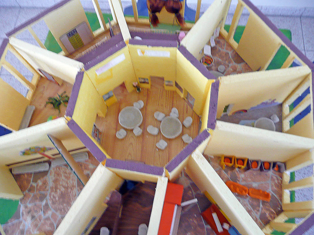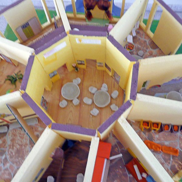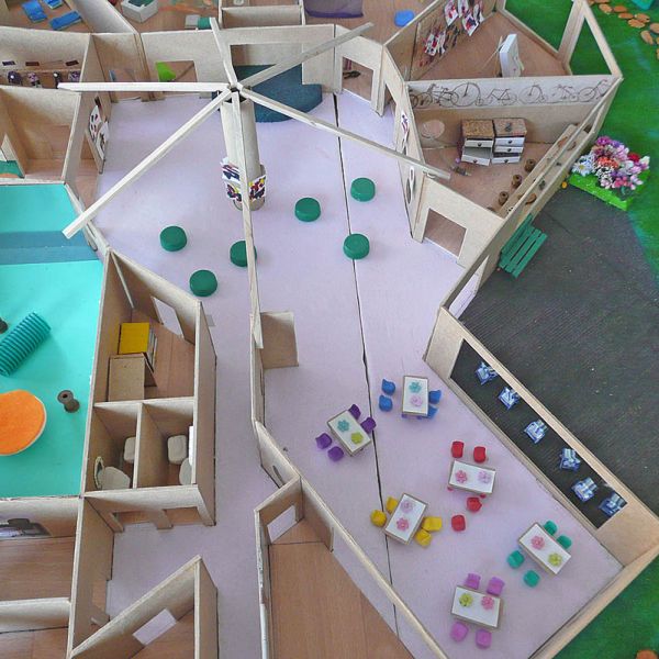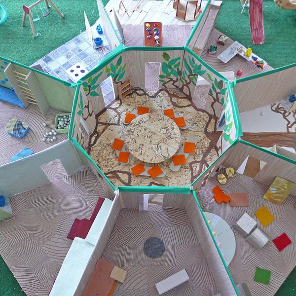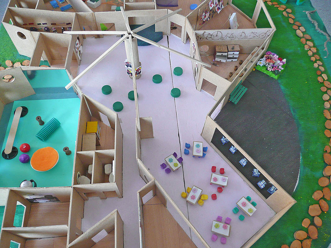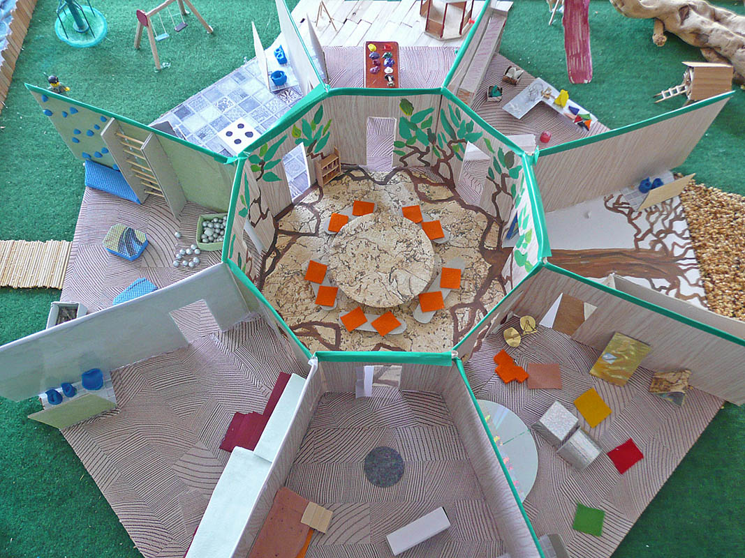 Zum Thema Raumgestaltung entwarfen die Schülerinnen und Schüler Modelle auf der Grundlage der Reggio-Pädagogik und des Situationsansatzes. Sie zeigen, dass man den Raum als 3. Erzieher versteht und die Lebenswelten der Kinder in die pädagogische Arbeit einbindet.