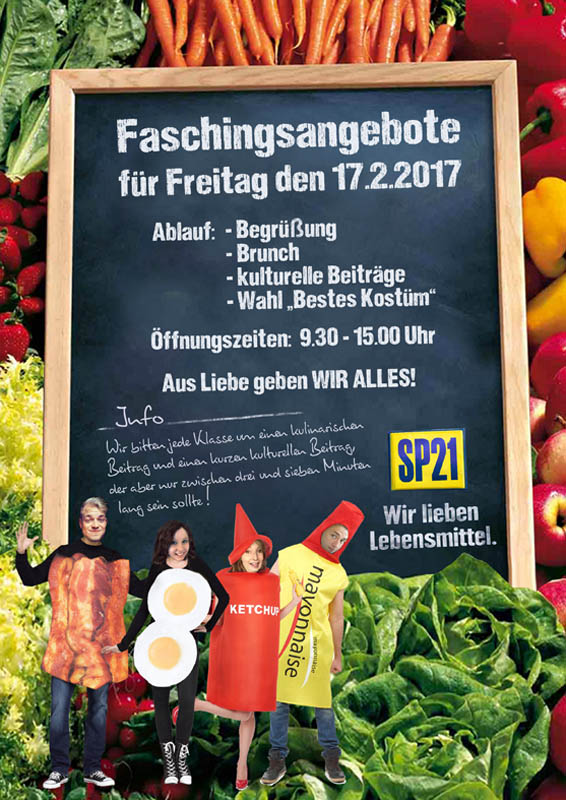 Die diesjährige traditionelle Faschingsfeier hat das o.g. Motto. Wir freuen uns auf kreative Ideen und selbstgebastelte Kostüme – ob als Gemüse oder tierische Produkte – wir sind gespannt. Die Klasse SP 21 in der Ausbildung zum Erzieher, zur Erzieherin werden die Vorbereitungen übernehmen und lernen dabei ganz praxisnah, wie solch eine Veranstaltung vorbereitet und durchgeführt wird. In Kindertagesstätten, Schulen und Horten ist der Fasching bei allen Kindern lang ersehnt.